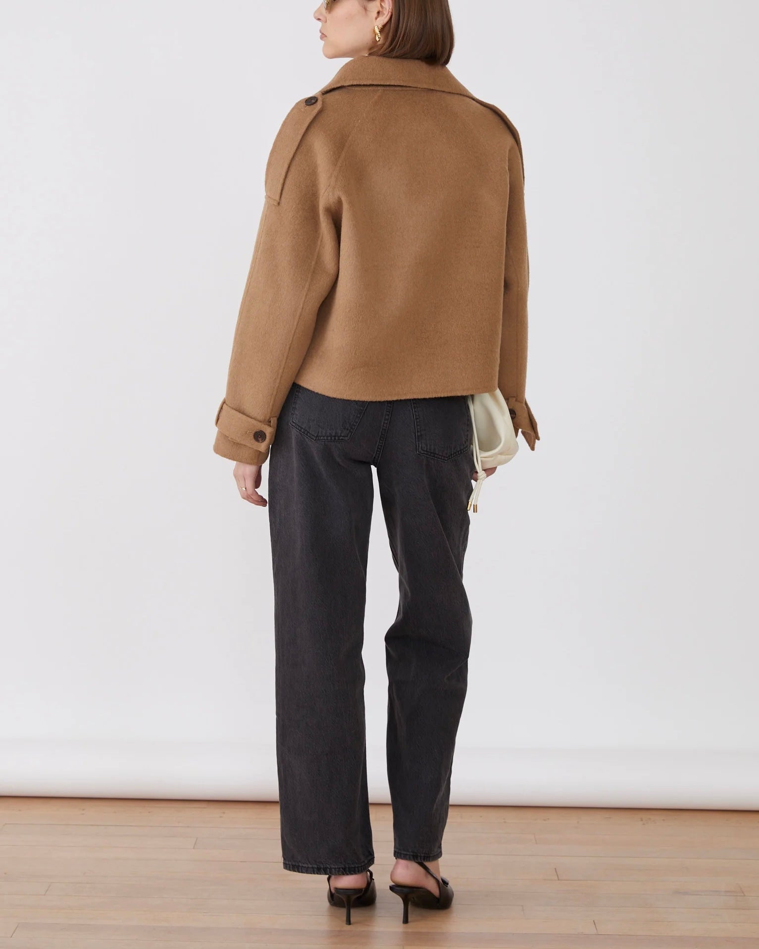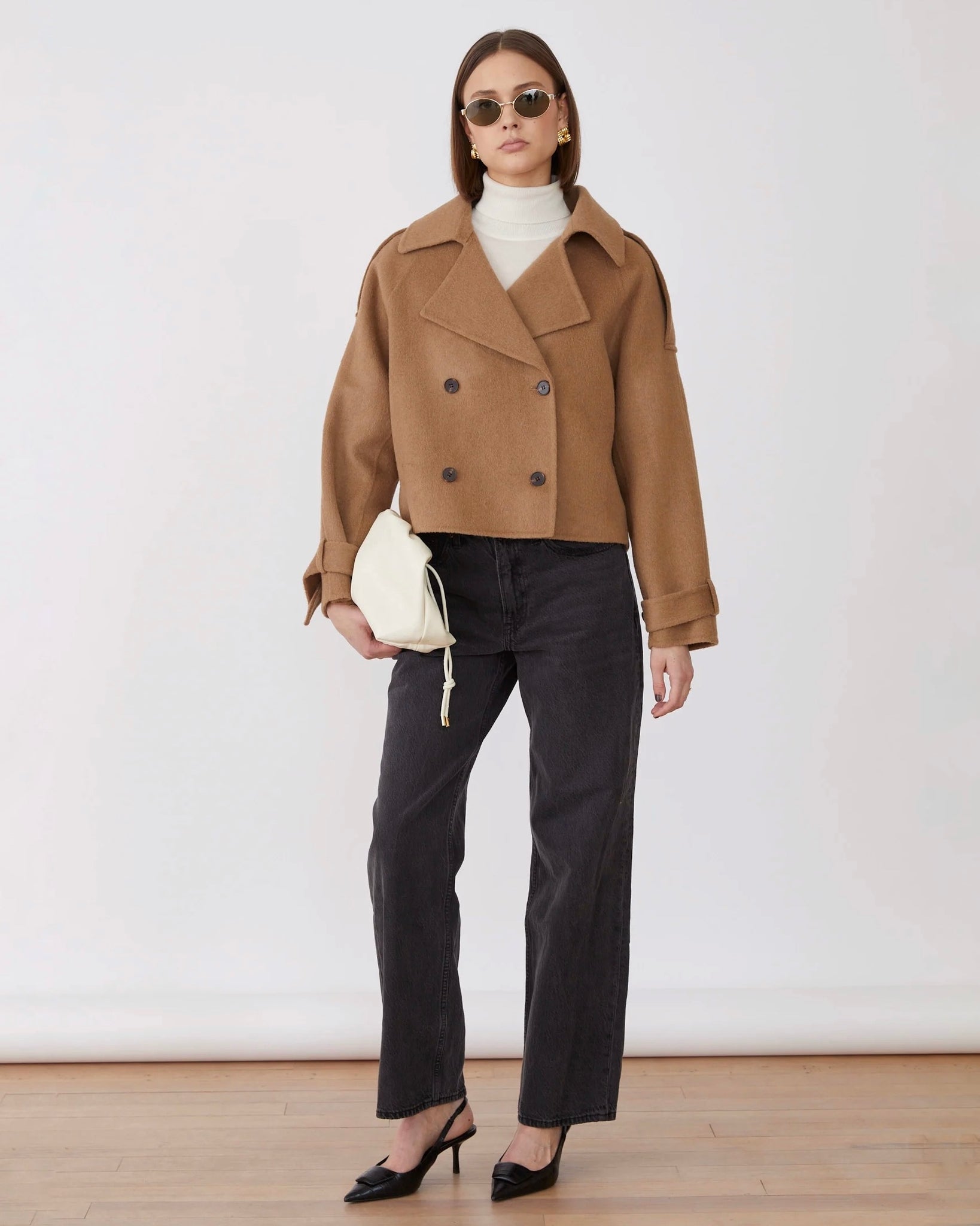 Abrigo cropped con corte cruzado, solapa. Botones delanteros, bolsillos laterales. Confeccionado en lana