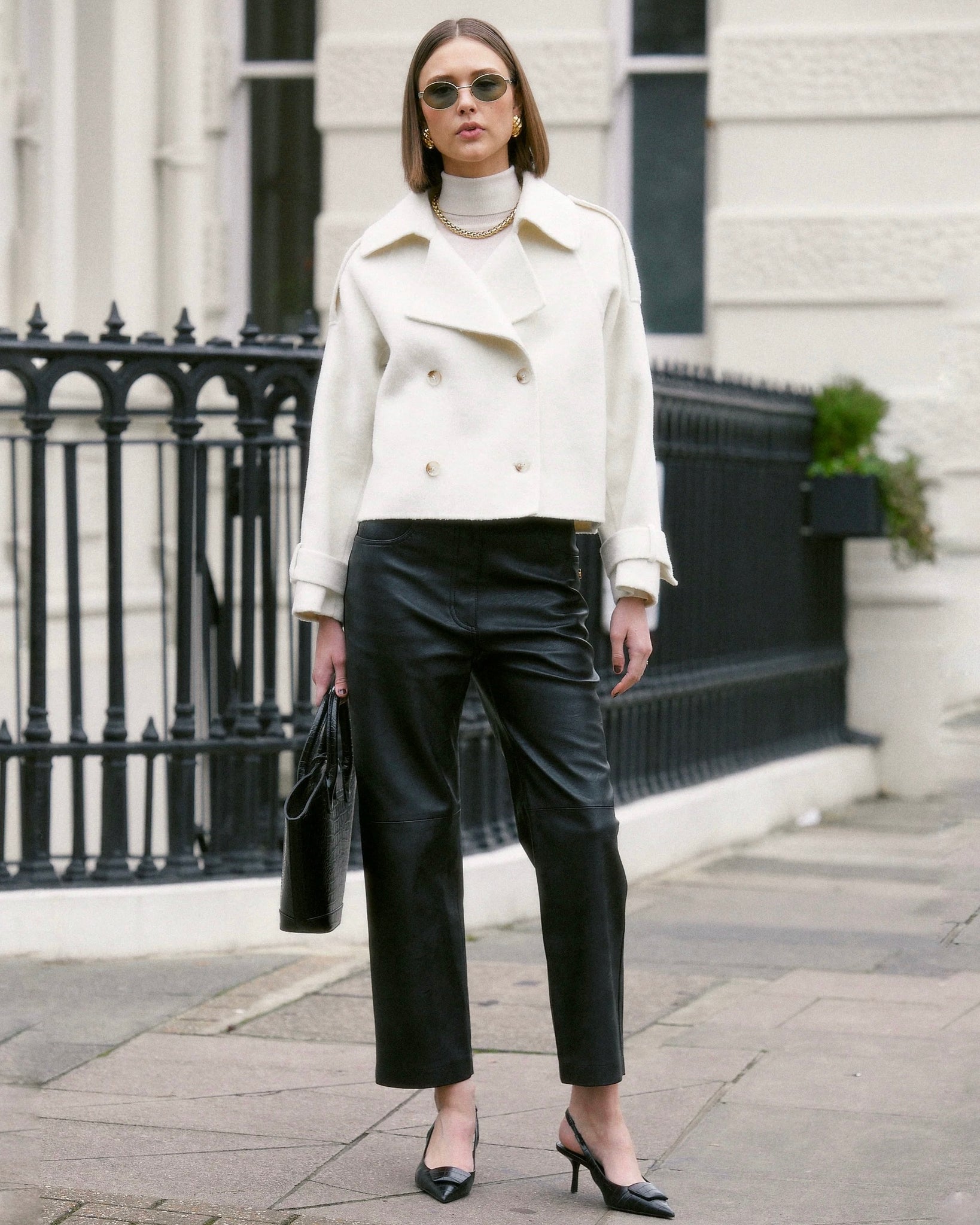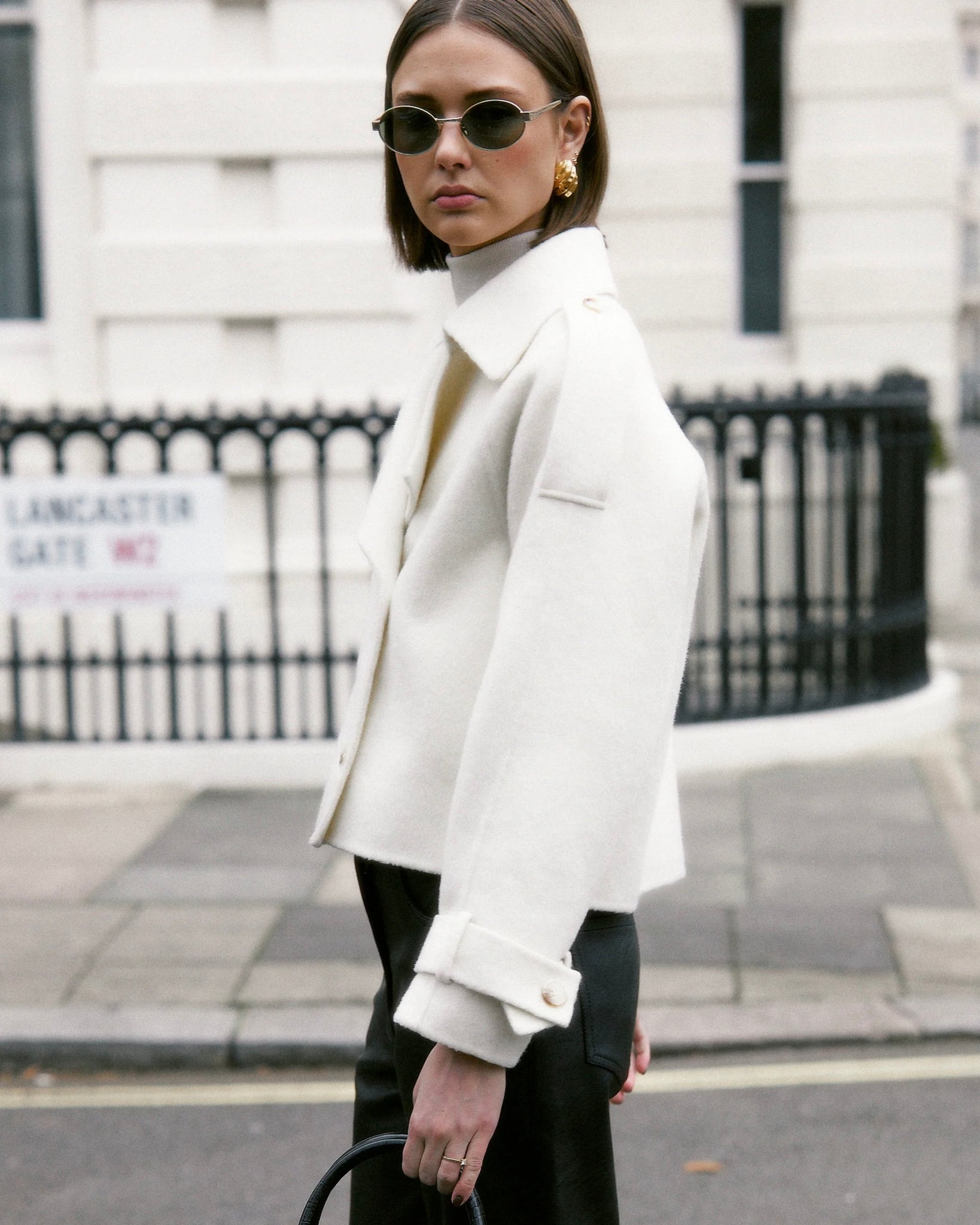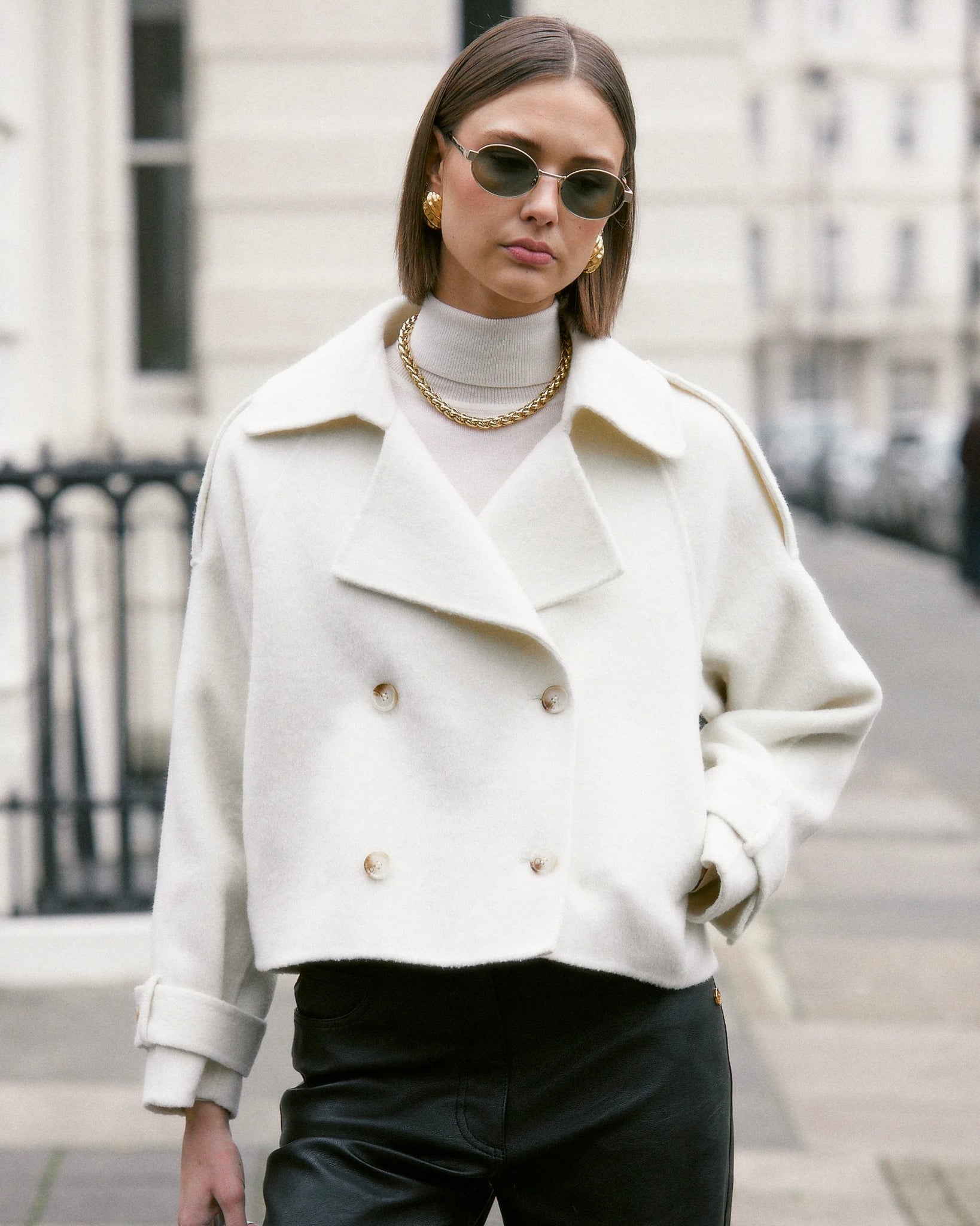 Abrigo cropped con corte cruzado, solapa. Botones delanteros, bolsillos laterales. Confeccionado en lana