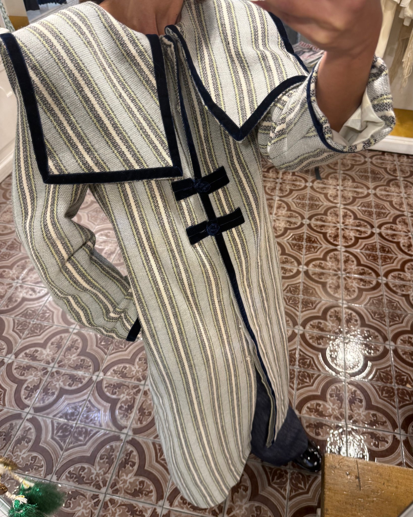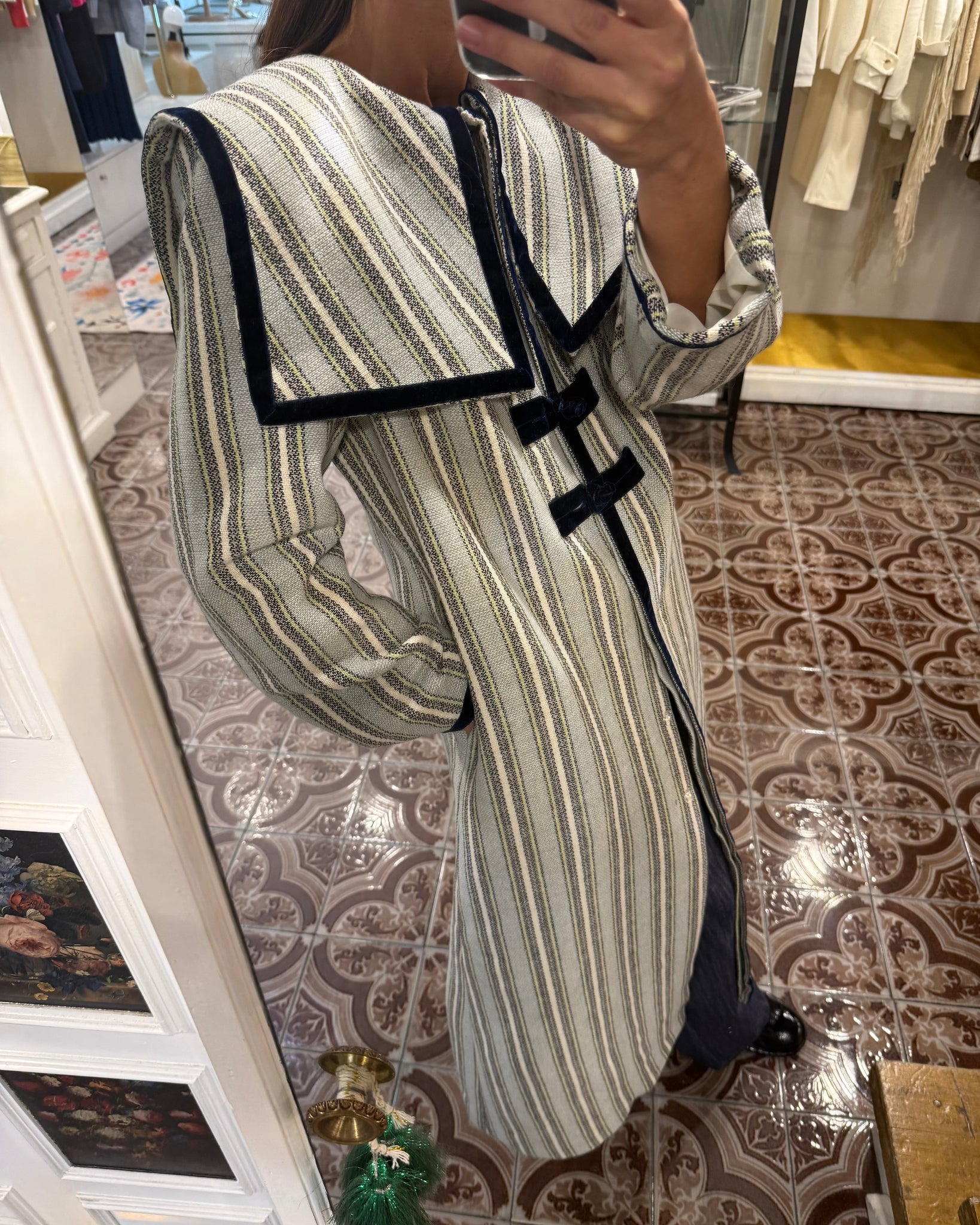 Abrigo largo de corte recto, confeccionado en un tejido grueso con rayas verticales en tonos crema, verde oliva y gris. La pieza más distintiva es su gran solapa tipo capa, rígida y geométrica, rematada con un vivo de terciopelo azul marino que también aparece en los cierres frontales, formados por lazos o broches decorativos del mismo material.