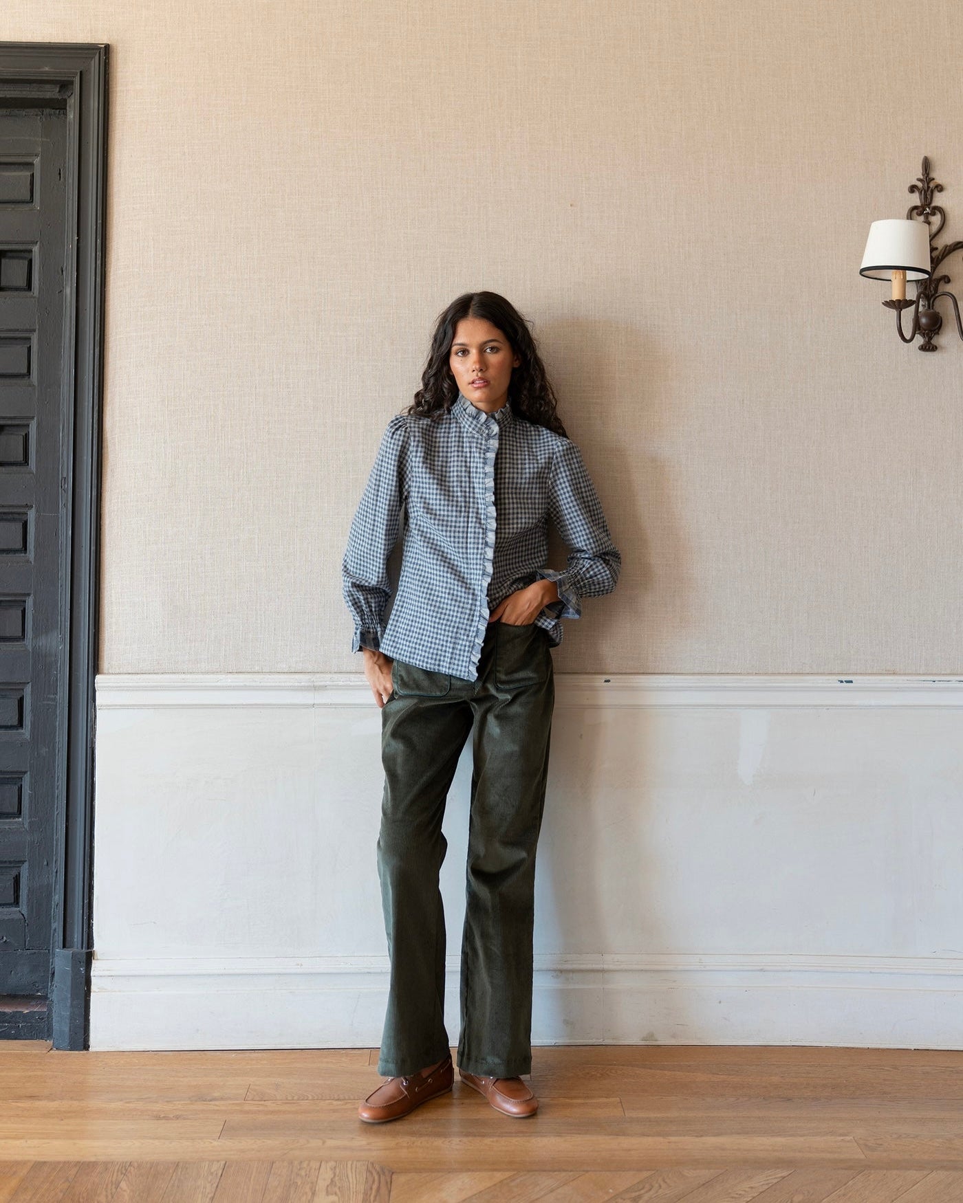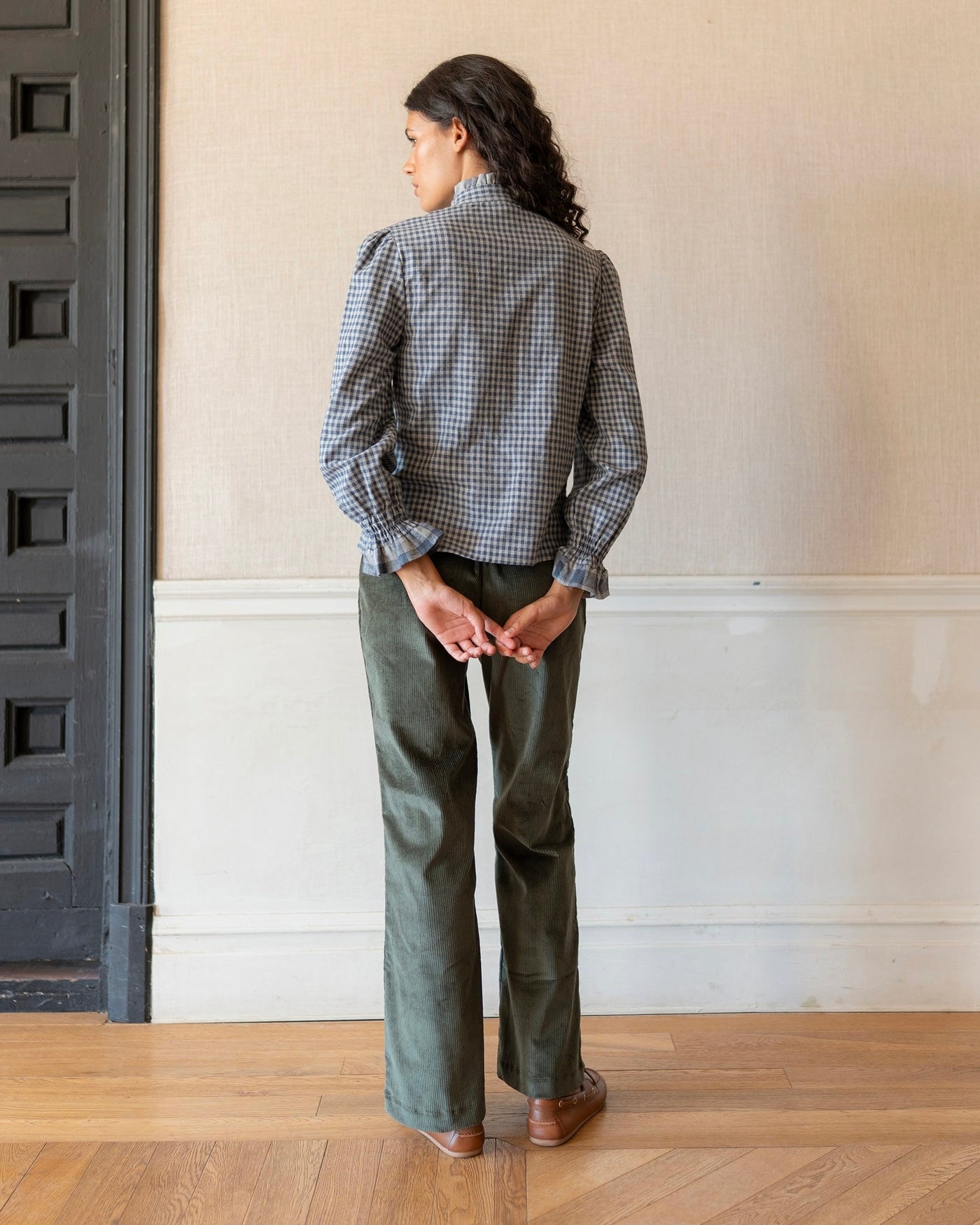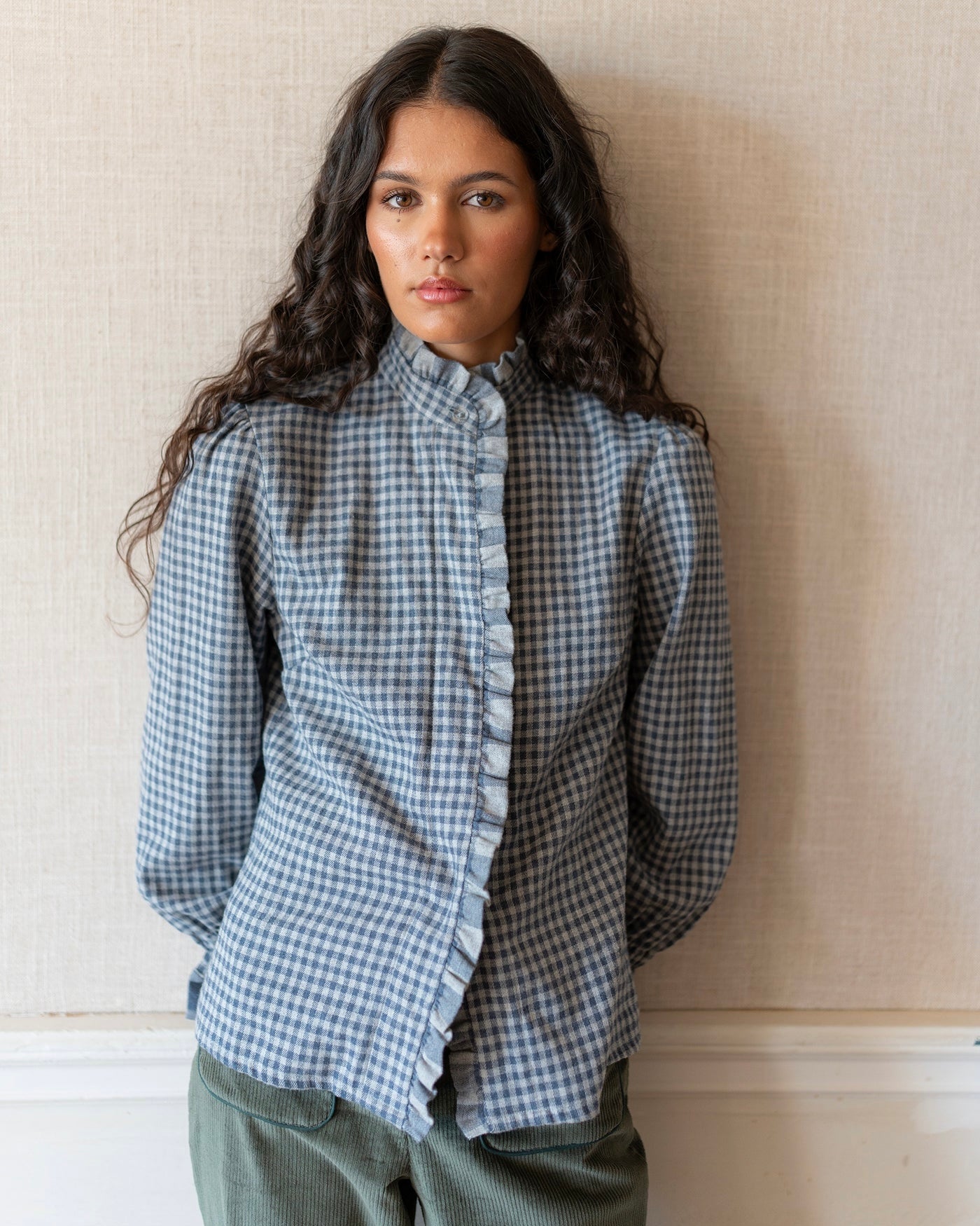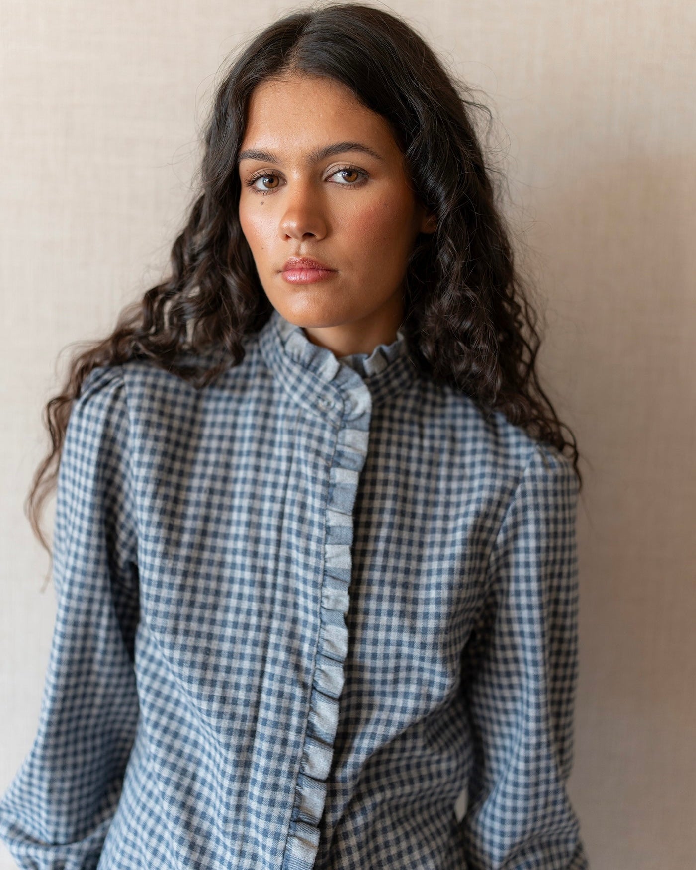 Sobrecamisa confeccionada en tejido vichy azul y beige con detalles en cuadro vichy más grande. Corte recto, volante delantero y en el cuello. Cierre con botones internos y manga con frunce para regular la altura. El tejido es semi grueso, “abrigado”