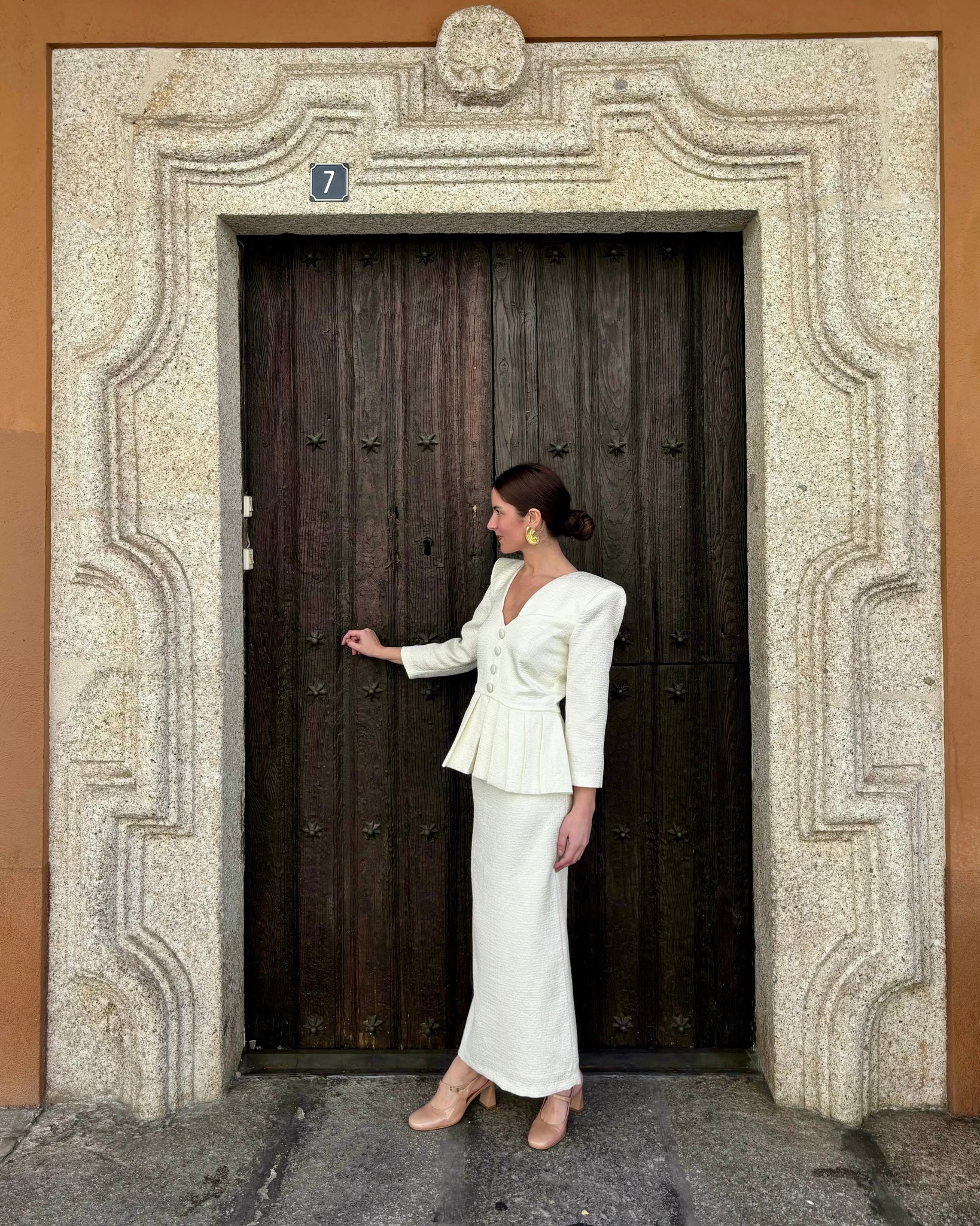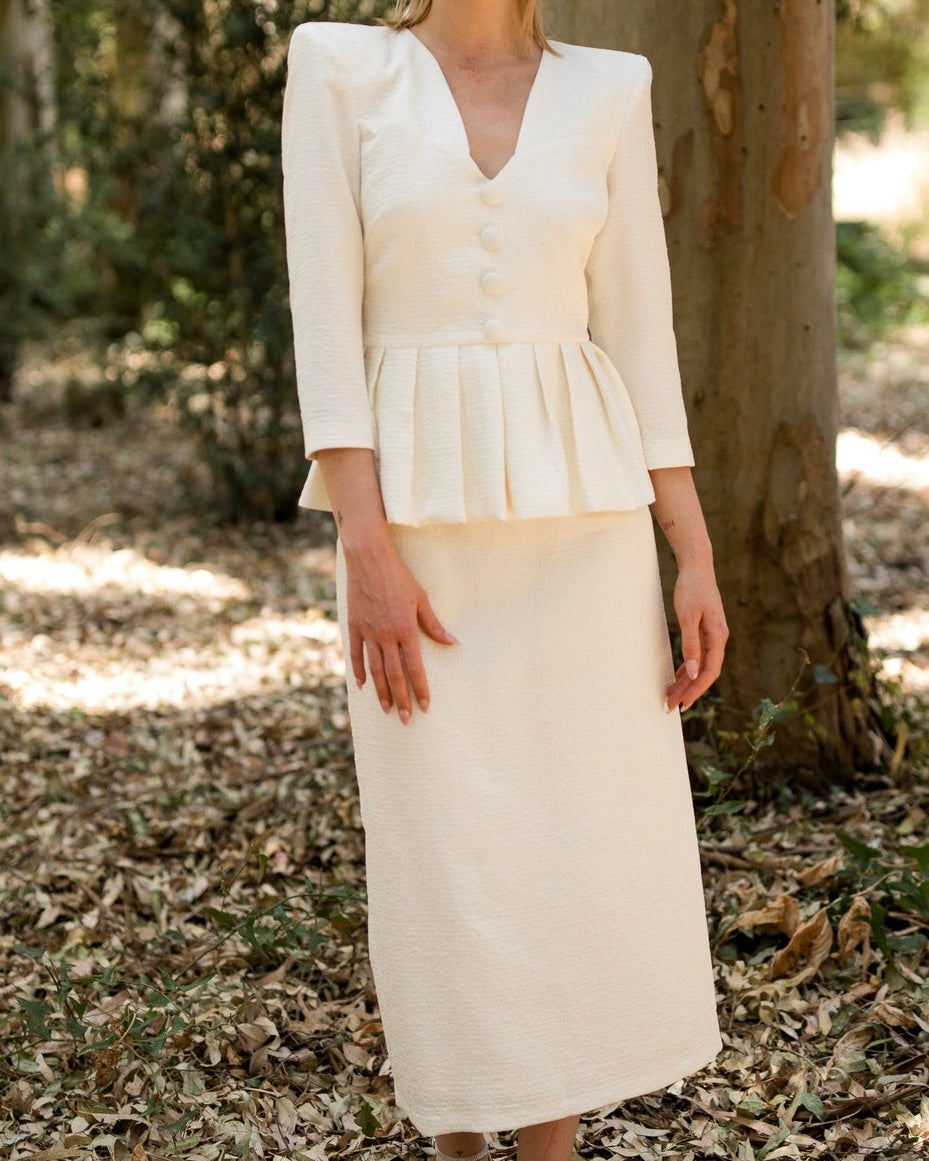 Conjunto de dos piezas confeccionado en jacquard rústico. El Péplum es el centro de atención del look, su cinturilla ajustada, sus hombreras marcadas y su escote en V son el ensamble perfecto. El volante del péplum proporciona volumen, estructura y movimiento a la prenda. La combinación de la falda midi con apertura posterior aportan naturalidad a este elegante dos piezas. Una elección de lo más acertada para cualquier evento