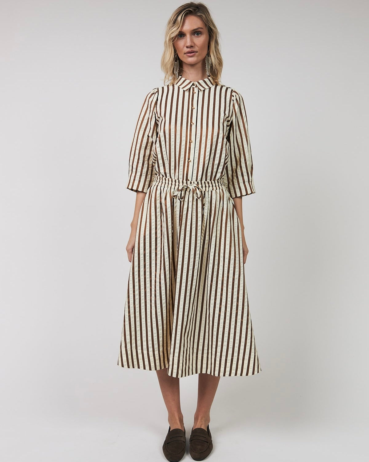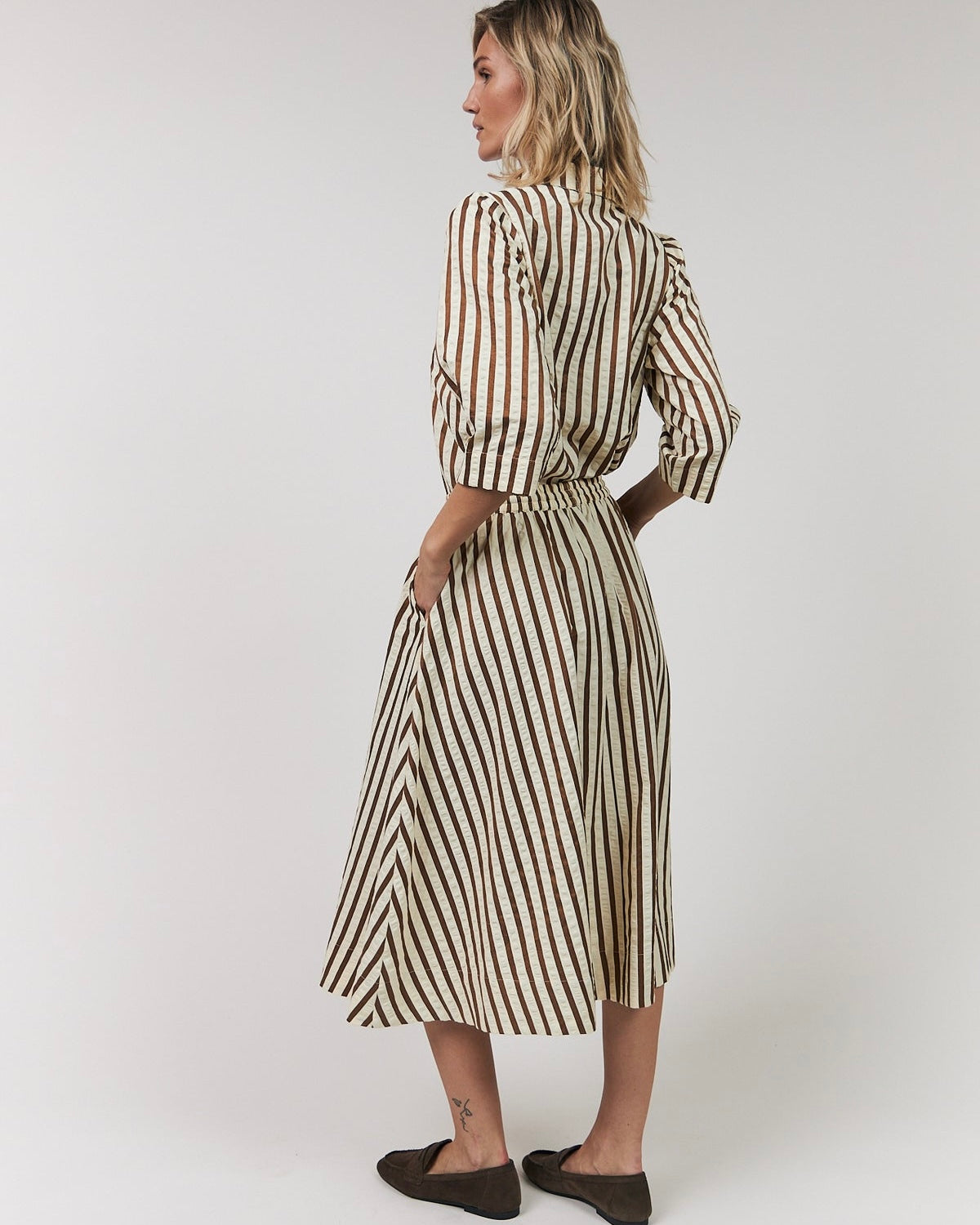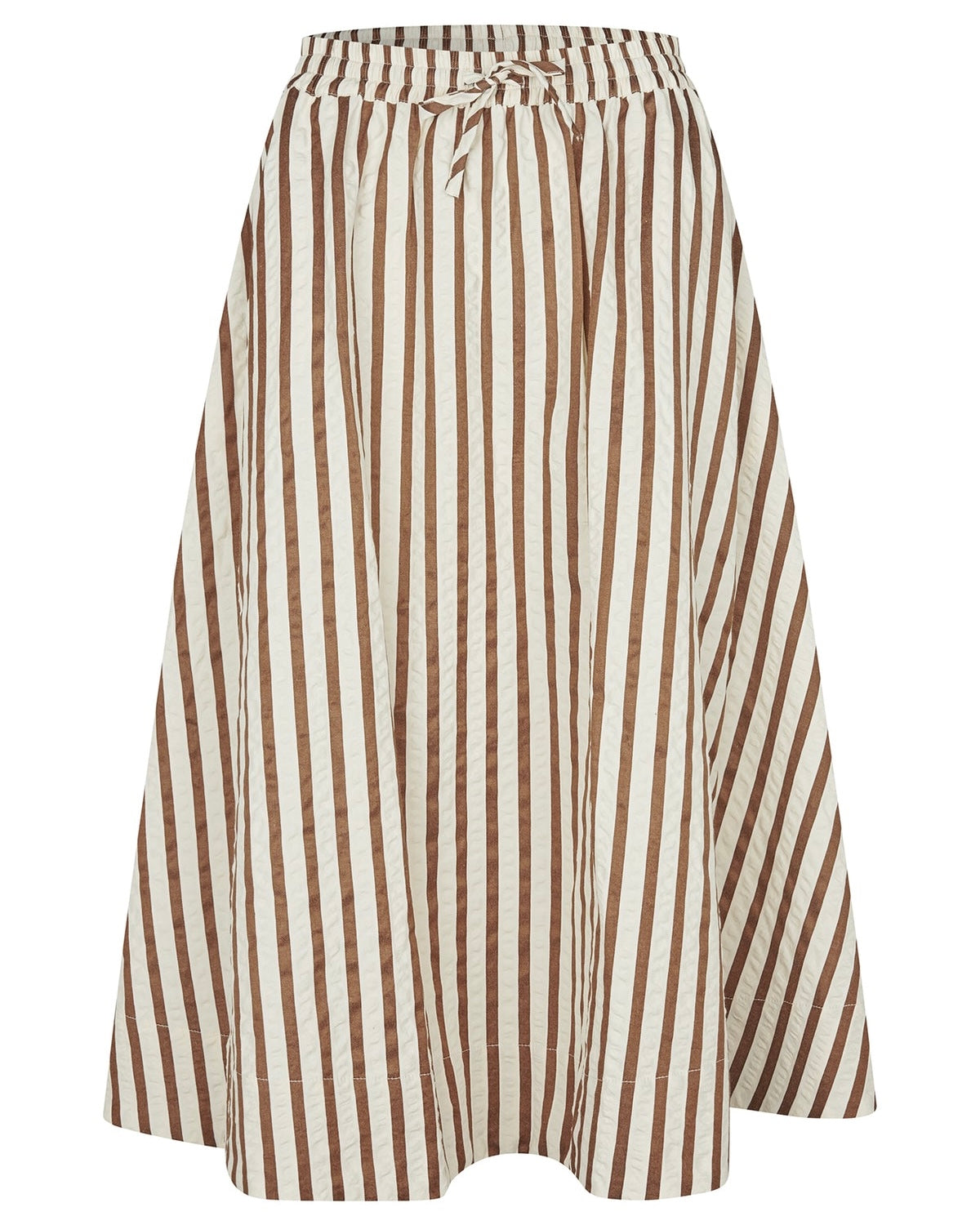 Falda ligera y femenina con bonitas rayas. La cintura elástica con cordón garantiza un ajuste cómodo, mientras que la silueta amplia crea un look elegante y encantador.