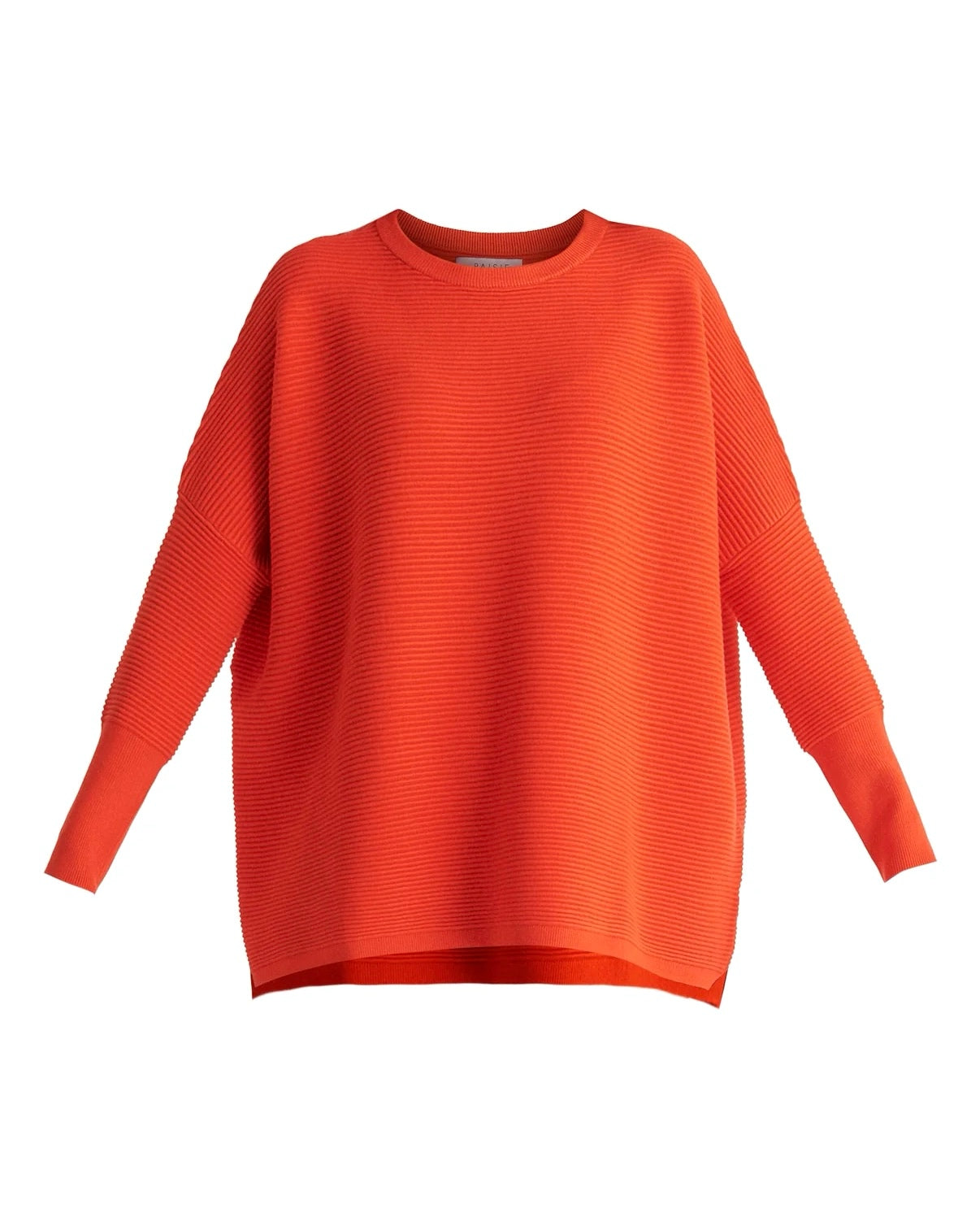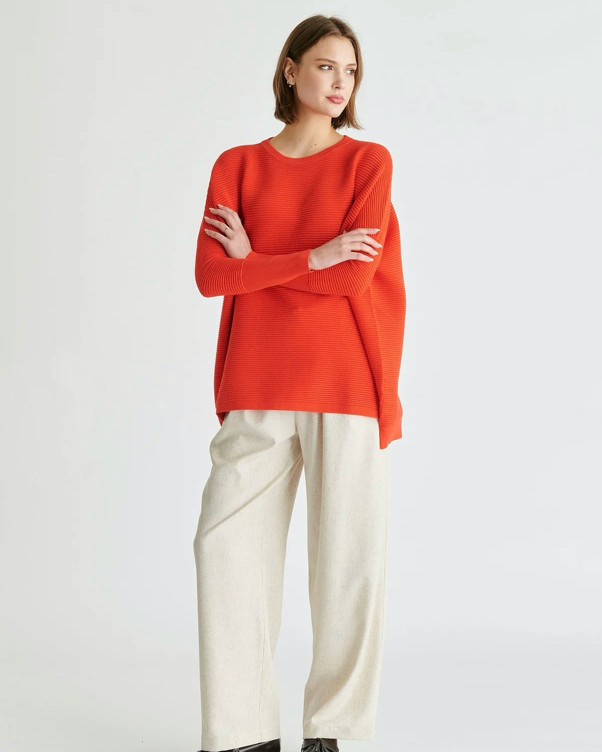 Jersey ancho, con cuello redondo. Manga ajustada hasta el codo. Más largo por detrás que por delante. En color naranja