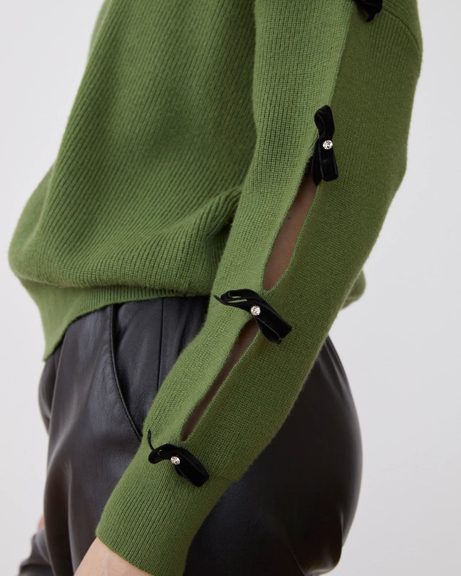 Jersey de punto en color verde musgo, con detalle de aberturas con lacitos negros en terciopelo con perlita en medio. Cuello redondo