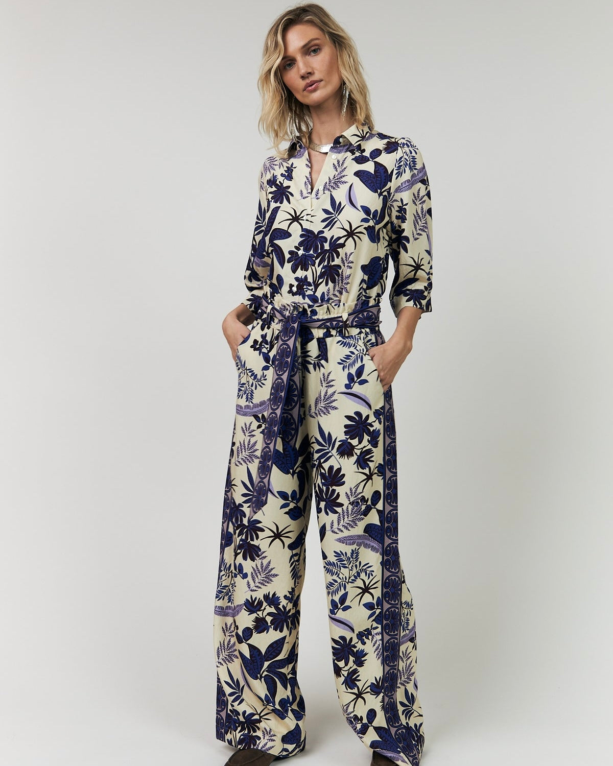 Pantalón ligero y aireado con un bonito estampado que aporta mucho color y personalidad a tu look. Presentan un ajuste relajado, una cintura elástica y un cinturón ancho que resalta maravillosamente tu cintura. Combínalos con la camisa con el mismo estampado para lograr un look completo que casi parece un mono. Estampado artístico en dos hermosas combinaciones de colores.