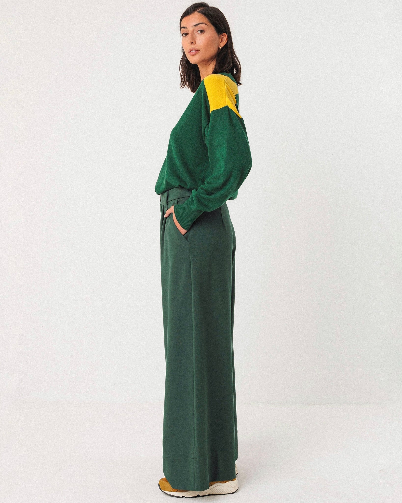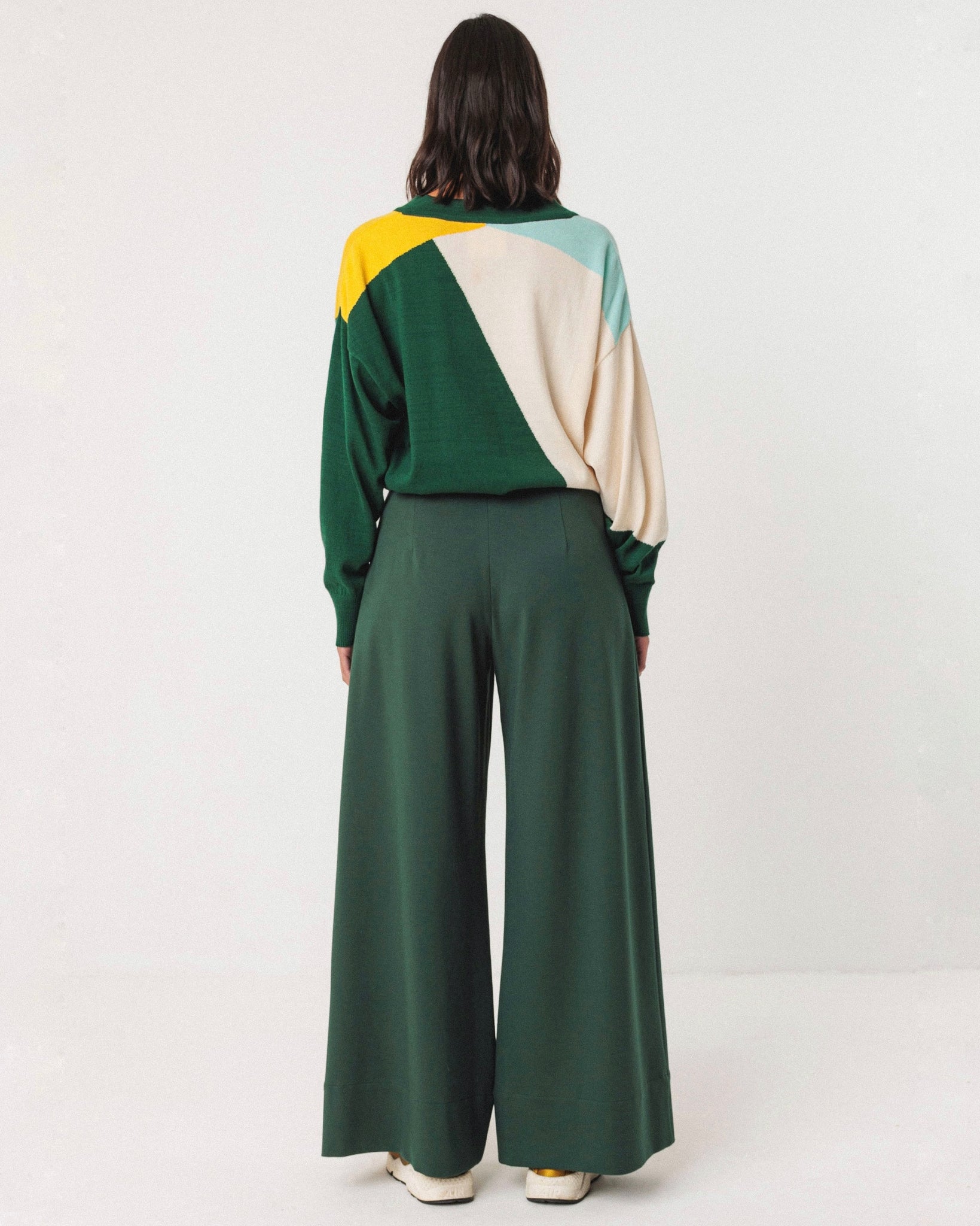 Pantalón palazzo de corte hasta el tobillo. Bolsillos al bies y bragueta con cremallera delantera