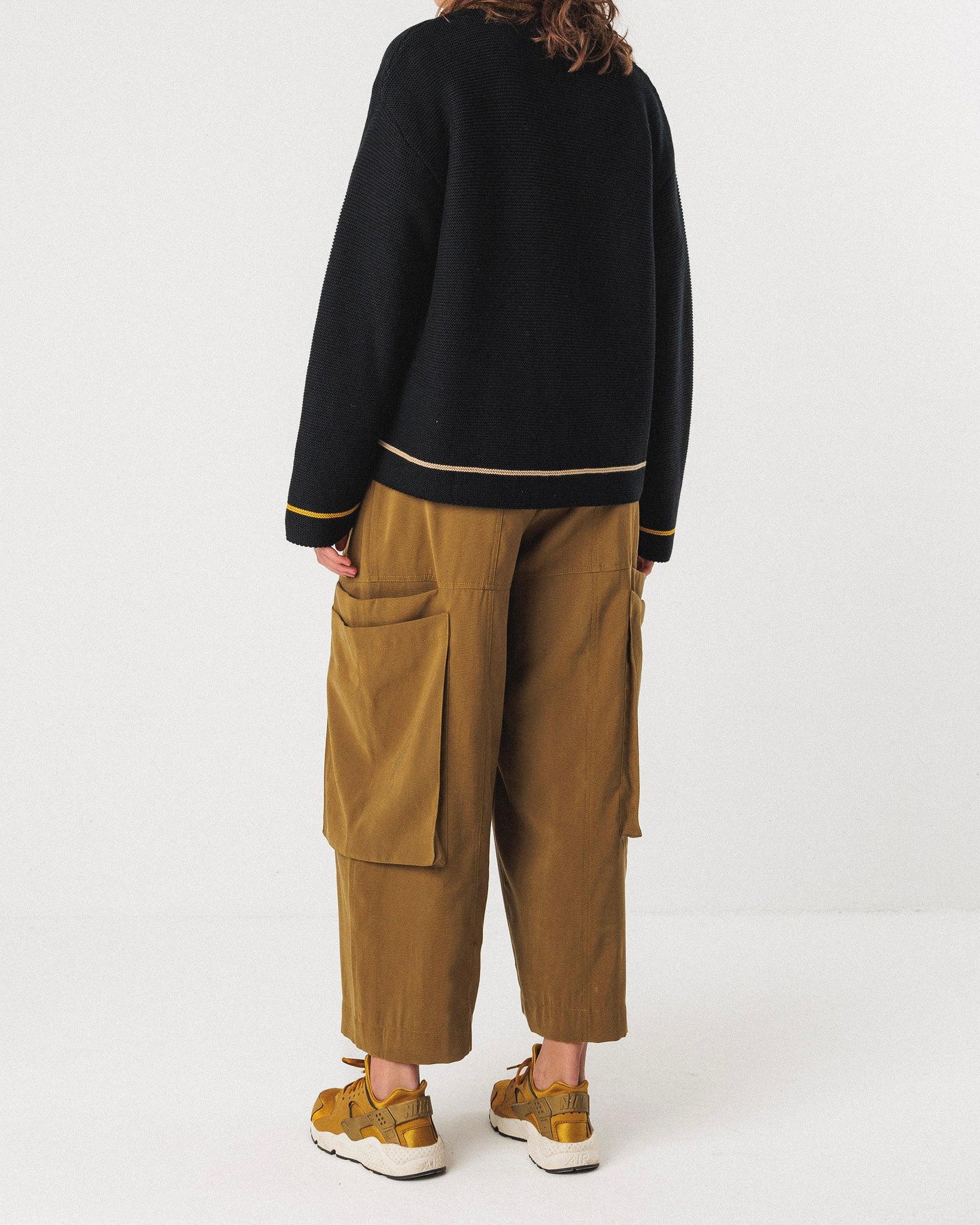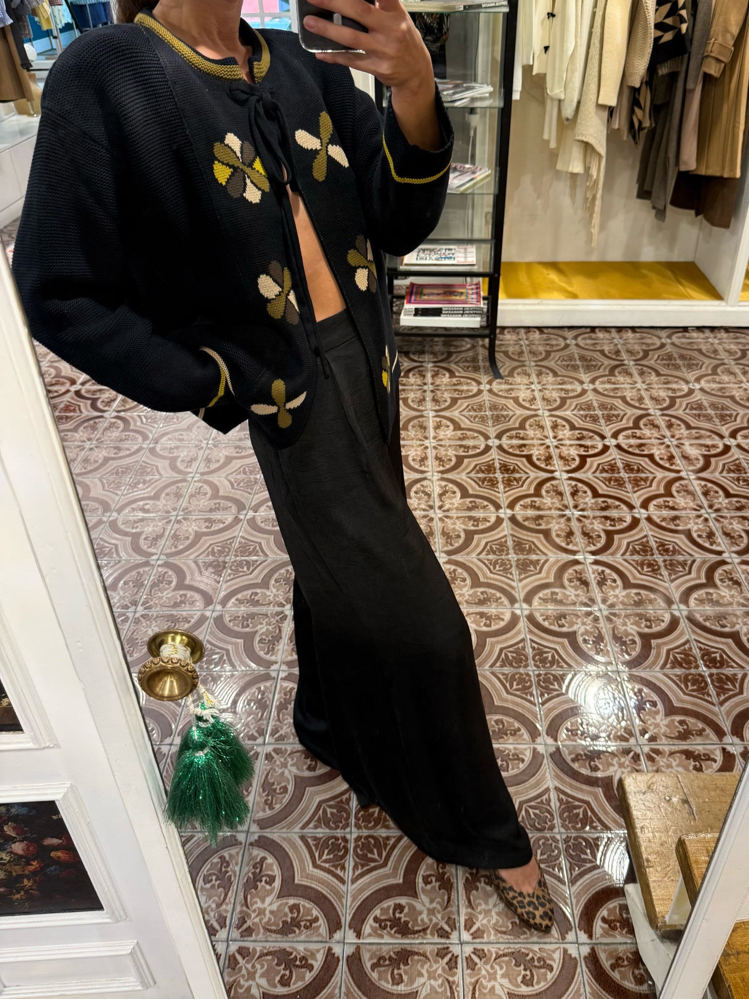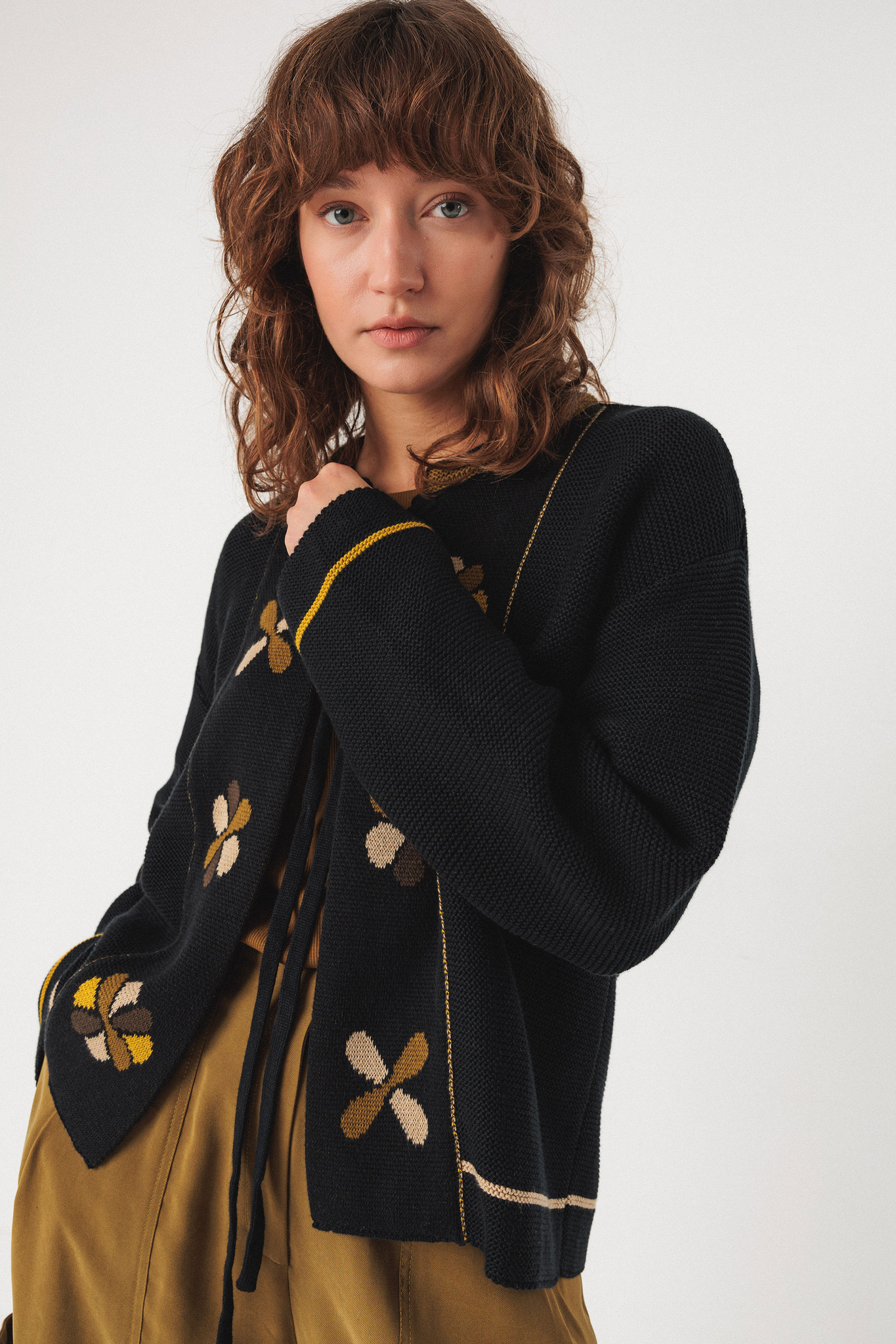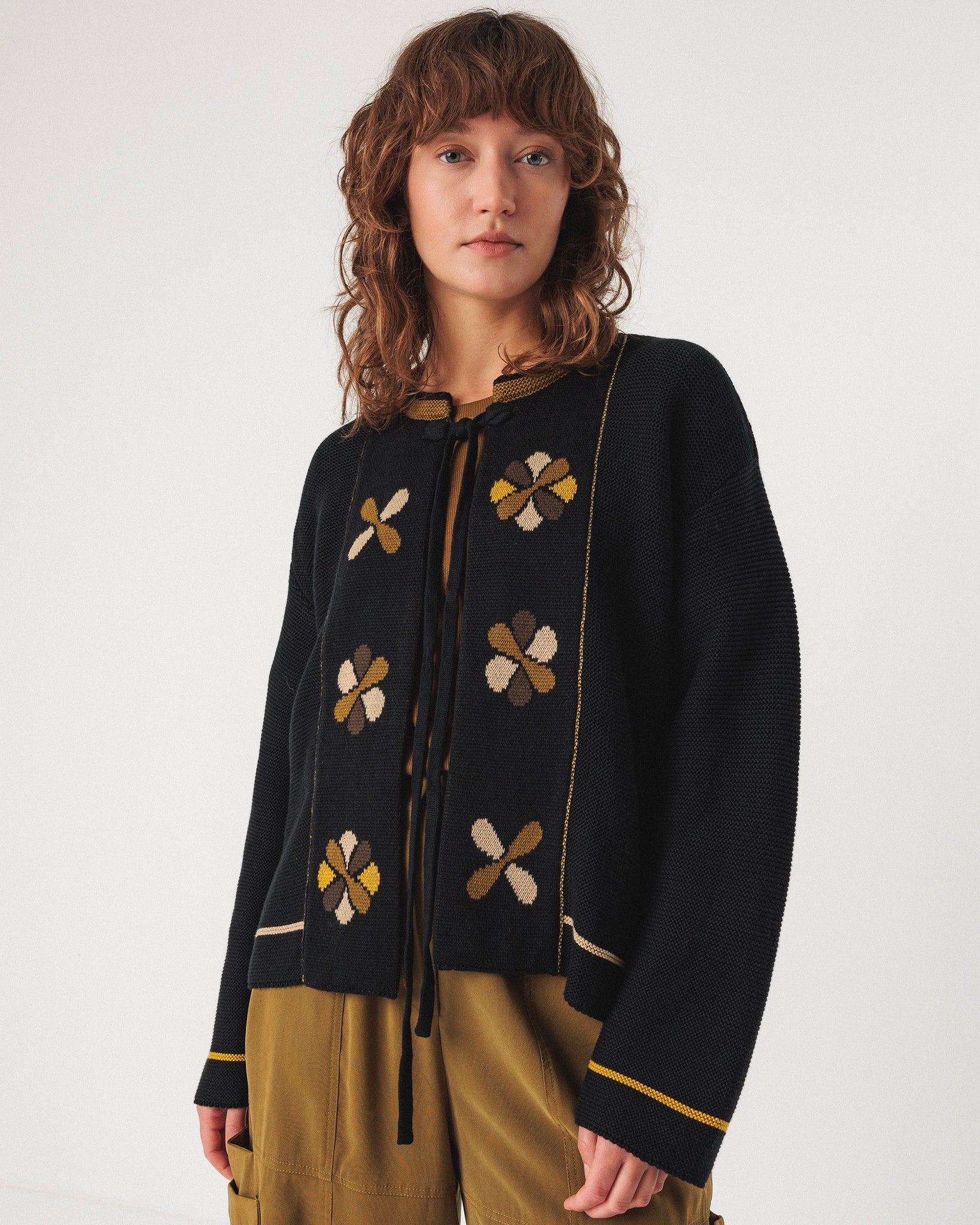 Cárdigan de punto grueso inspirado en las tradicionales chaquetas vascas mendigoizal. Se cierra anudando unos cordones