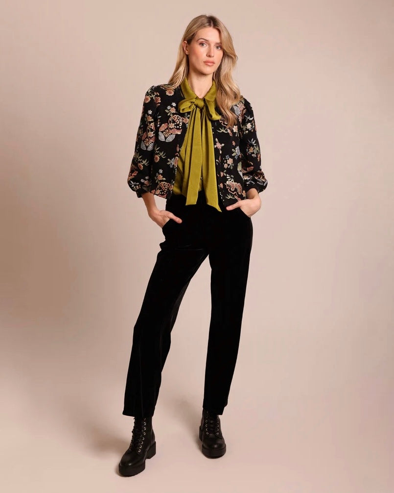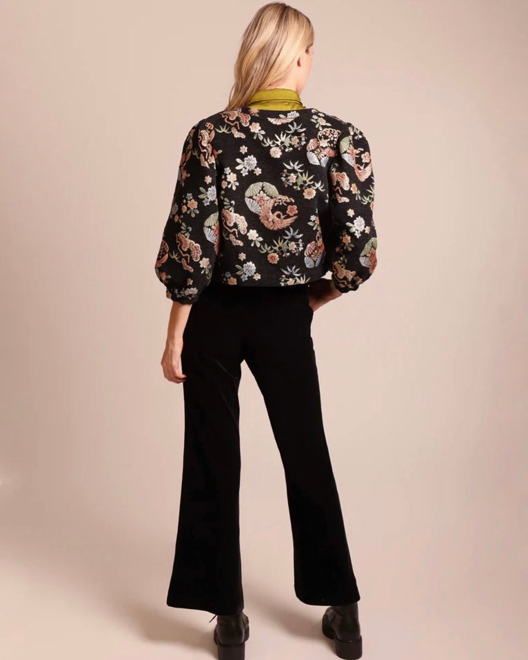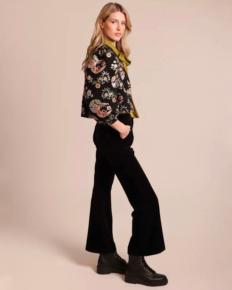 Chaqueta corta aterciopelada en fondo negro con flores bordadas con hilos brillantes, cierre en el principio con un pequeño botón. Manga super globo