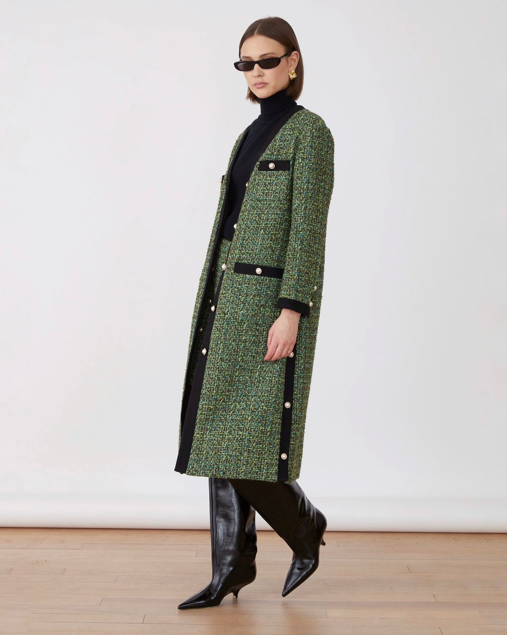 Abrigo/vestido en tejido de tweed. Mezcla de colores todos al tono en verde, con hilo dorado. Con vivos en negro. Botones redondos joya