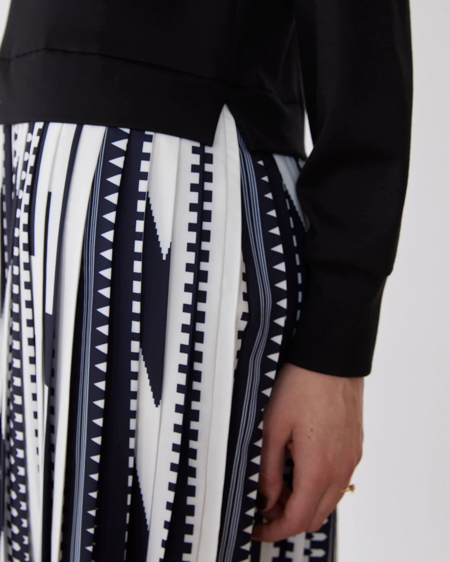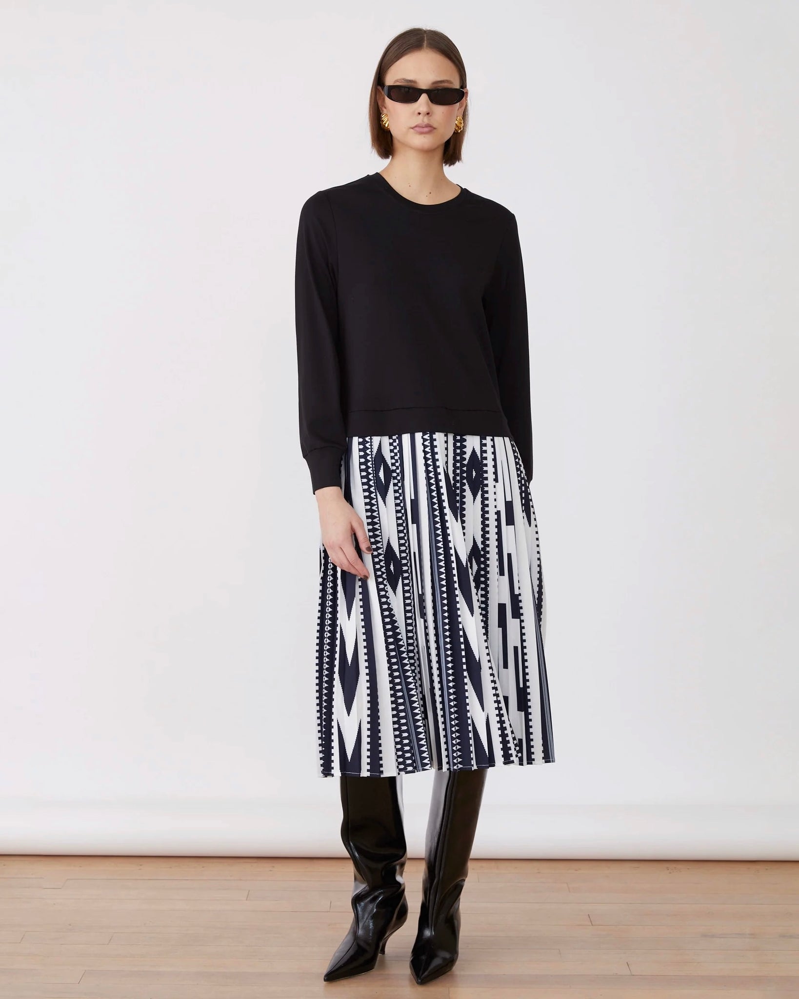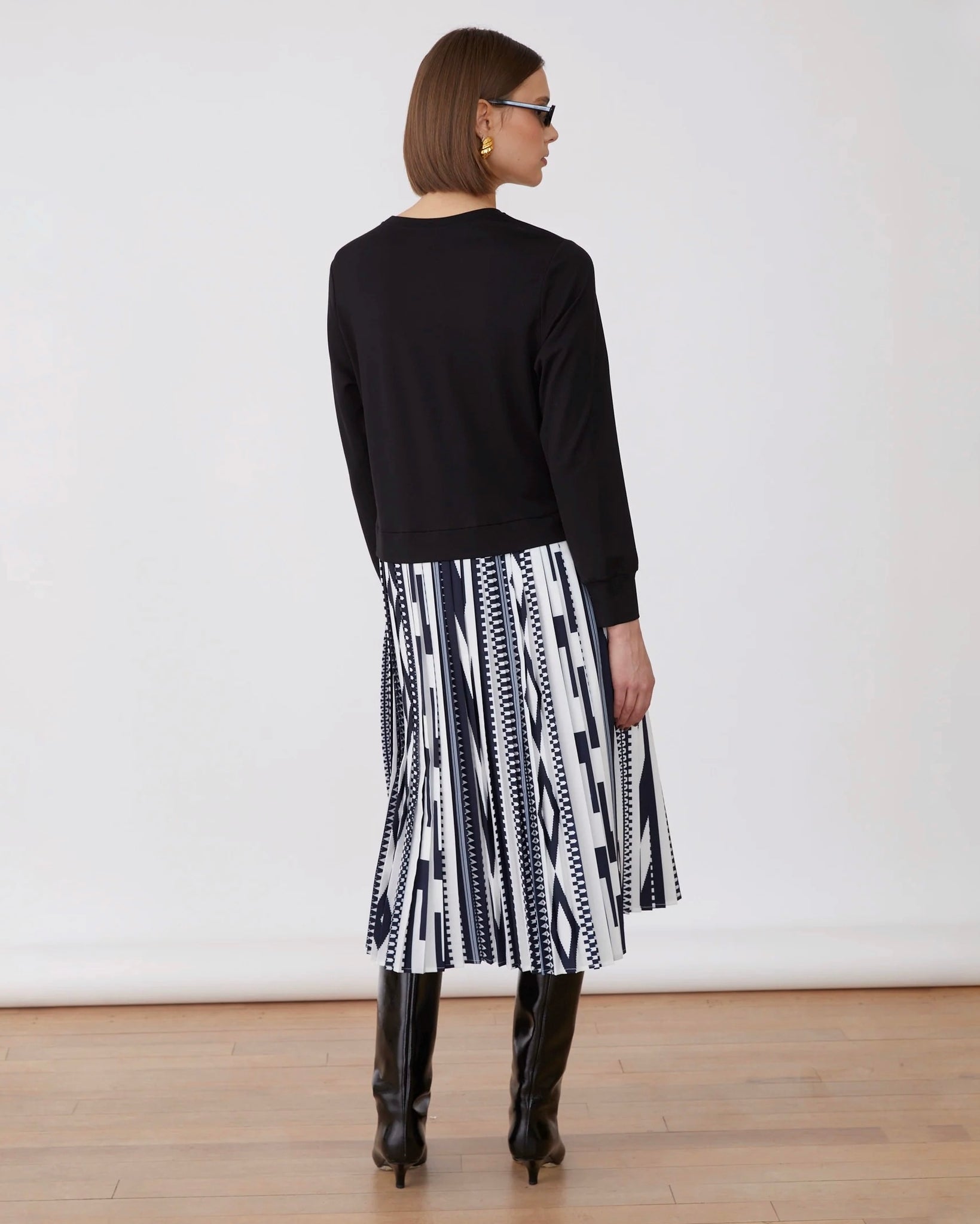 Vestido combinado en tejido de sudadera y tablas en la falda. Largo mido, estampado bicolor en la parte de la falda. Parte superior tejido de sudadera con cuello redondo